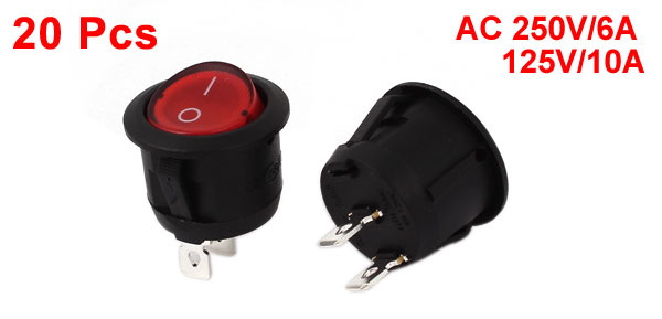 AC 250V/6A 125V/10A SPST 2 Position 2 Pin Red Button Round Rocker Switch 20PCS