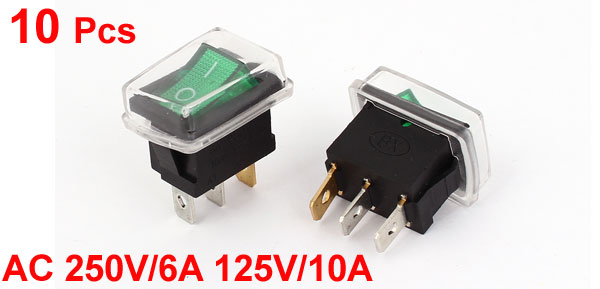 AC 250V/6A 125V/10A SPST ON/OFF 3 Pin Green Light Waterproof Rocker Switch 10PCS
