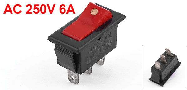 Product Name Rocker Switch Connection Type SPDT Position On-Off Terminals Number 3 Voltage/Current AC 250V/6A Total Size 33 x 16 x 25mm/ 1.3" x 0.6" x 1"(L*W*H) Mounted Size 30 x 12 x 14mm/ 1.1" x 0.47" 0.55"(L*W*H) Switch Color Black, Red Material Plastic, Metal Weight 7g Package Content 1 x Rocker Switches - Reviews