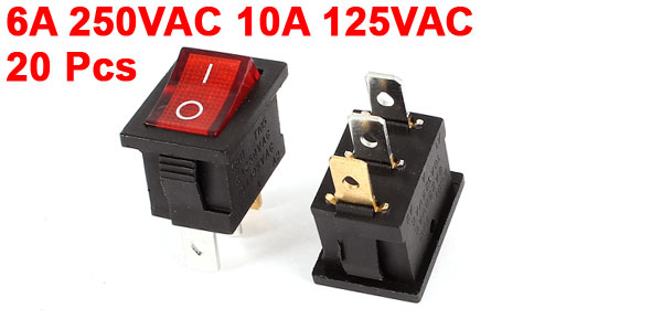 Product Name Rocker Switch Action SPST Terminals 3 Pin (ON-OFF) Light Color Red Rating Voltage 6A 250VAC 10A 125VAC Total Size 2 x 1.5 x 2.7cm/1" x 0.6" x 1"(L* W *T) Mounting Dimension 1.8 x 1.2cm/0.7" x 0.47"(L*W) Color Black, Red, Silver Tone Material Plastic & Metal Total Weight 86g Package Content 20 x Rocker Switch - Reviews