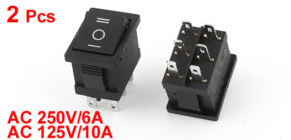 Product Name Rocker Switch Action DPDT Terminals 6 Pin (ON-OFF-ON) Rating Voltage AC 250V/6A AC 125V/10A Total Size 21 x 15 x 25cm/0.83" x 0.6" x 1"(L* W *T) Mounting Dimension 19 x 13mm/0.75" x 0.5"(L*W) Color Black, Silver Tone Material Plastic, Metal Total Weight 11g Package Content 2 x Rocker Switch - Reviews