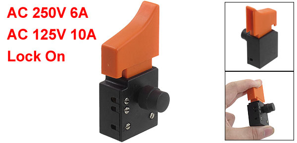 Product Name Trigger Switch Model No. FA2-6/2B Contact Type SPST, 1NO 1NC Action Type Lock On Rating AC 250V 6A, AC 125V 10A Button Size 2.9 x 0.6cm/ 1.14" x 0.24"(L*W) Size 2.9 x 2.6 x 6.1cm/ 1.14" x 1.02" x 2.4" (L*W*H) Material Plastic, Matel Color BlackM Orange Weight 26g Package 1 x Trigger Switch - Reviews