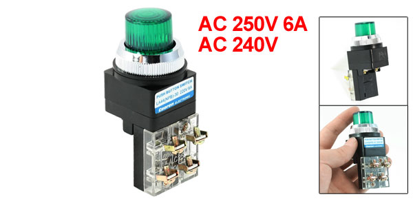 LED Voltage AC 240V Terminal Quantity 6 Panel Cutout Diameter 30mm / 1.2" Fit Panel Max. Thickness 9mm / 0.35" Button Diameter 20m / 0.8" Total Size(Approx) 3.6 x 3.2 x 8.8cm / 1.4" x 1.3" x 3.5" (L*W*H) External Material Plastic, Metal Button Color Green, Black Net Weight 63g Package Content 1 x Push Button Switch - Reviews