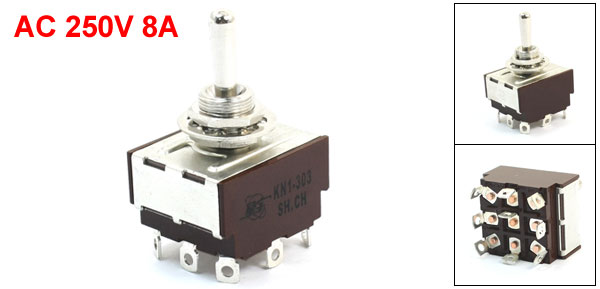 Product Name Toggle Switch Model KN1-303 Type 3PDT (Latching) Position 3 Positions(ON/OFF/ON) Voltage, Current AC 250V 8A Mounting Thread Diameter 12mm / 0.47" Body Size 34 x 28 x 19mm / 1.3" x 1.1" x 0.75" (L*W*H) Total Height 55mm/ 2.2" Material Metal, Resin, Plastic Main Color As Picture Shown Weight 46g Package Content 1 x Toggle Switch - Reviews