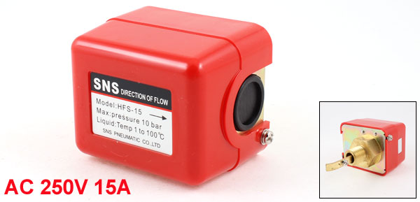 Product Name Paddle Flow Switch Model HFS-15 Switch Type SPDT Max Pressure 10Bar Liquid Temperature 1 to 100 Celsius Degree Voltage AC 250V, 15A Thread Diameter 2cm/ G1/2 Total Size 12.5 x 8 x 6cm/4.9'' x 3.1'' x 2.4''(L*W*H) Paddle Size 4.2 x 1.6cm/1.6" x 0.6"(L*W) Material Metal, Plastic Color Gold Tone, Red Weight 391g Package Content 1 x Paddle Flow Switch - Reviews