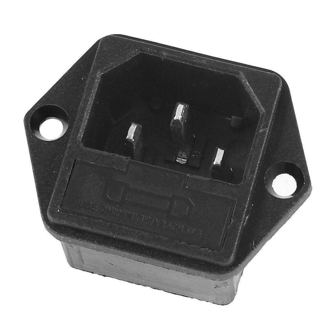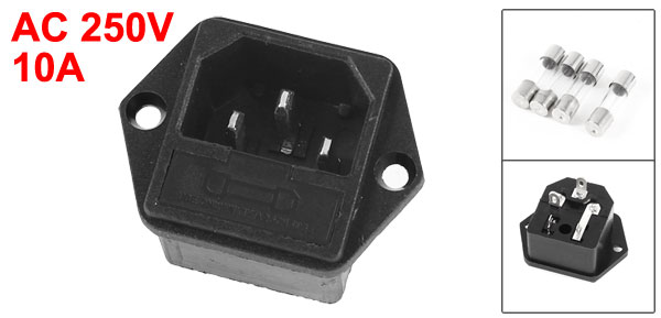 DetailsAC 250V Pannel Mount C14 Male Plug Inlet Power Socket w 4 Pcs 5mmx20mm Fuse 10A  Product Name Power Inlet Socket Power Supply AC 250V 10A Plug Type IEC 320 C14 Pins Number 3 Mounting Type Screw Type Mounting Size 3.1 x 2.7cm / 1.2" x 1.1" (L*W) Mounting Hole Diameter 3.6mm / 0.14" Overall Size 4.4 x 3.3 x 2.9cm / 1.7" x 1.3" x 1.1" (L*W*T) Fuse Size 5 x 20mm / 0.2" x 0.8" (D*L) Fuse Power 10A Material Plastic, Metal Color Black, Silver Tone Net Weight 18g Package Content 1 x Power Inlet Socket