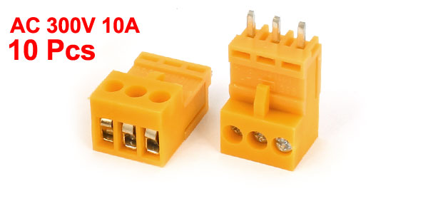 DetailsAC 300V 10A 3 Pin 3.96mm Pitch PCB Mounted Screw Terminal Block Connector 10 Pcs  Product Name PCB Terminal Block Rated Value AC 300V 10A Pin Quantity 3 Pin Pitch 3.96mm/ 0.15" Male Size 14 x 7 x 12mm/ 0.55" x 0.28" x 0.5" (L*W*H) Female Size 22 x 10 x 12mm/ 0.87" x 0.4" x 0.5" (L*W*H) Material Plastic, Electric Parts Color Silver Tone, Orange Net Weight 56g Package Content 20 x PCB Terminal Block