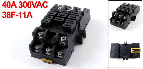 DetailsAC 300V 40A JQX-38F Relay 11 Terminals 34mm Din Rail Socket Holder 38F-11A  Product Name Socket Base Model 38F-11A Fit for HHC71B, HHC70-3, JQX-38F Rated Load 40A 300VAC Pin Quantity 11 Total Size(Approx) 8.6 x 5.4 x 2.9cm / 3.4" x 2.1" x 1.1" (L*W*H) Installing Hole Size 8 x 4mm / 0.31" x 0.16" (L*W) Mounting Rail Width 34mm / 1.3" External Material Plastic Main Color Black Weight 87g Package Content 1 x Socket Base