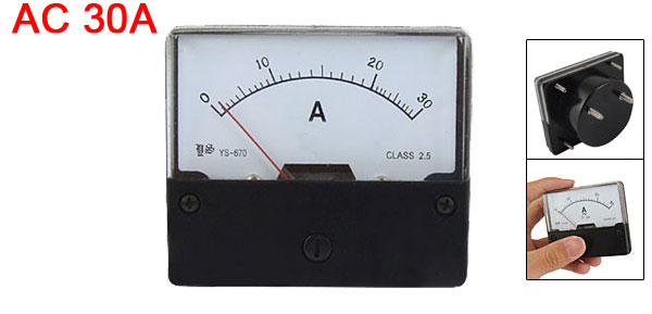 Product Name Analog Ammeter Model YS-670 Measuring Current Range AC 30A Accuracy Class 2.5 Meter Face Size(Approx.) 7 x 5.8 x 1.1cm/ 2.7" x 2.3" x 0.4"(L*W*T) Thread Size 0.4 x 1cm / 0.16" x 0.4"(D*L) 0.28 x 0.8cm / 0.11" x 0.31"(D*L) Base Diameter 5cm/2'' Overall Depth 3.4cm/ 1.3" Screw Spacing 2.8cm/1.1'' 4.8m/1.9'' Color Black, White Net Weight 74g Package Content 1 x Analog Ammeter Several Installing Parts - Reviews