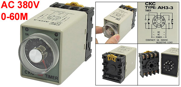DetailsAC 380V 0-60 Minutes 8 Pin DIN Rail Delay Timer Time Relay w Base AH3-3  Product Name Time Relay + Socket Type AH3-3 Rated Voltage 380VAC Contact 5A 250VAC Resistive Load Time Range 0-60 Minutes Number of Terminals 8 Mount Rail Type DIN Rail Mount Hole Diameter 4mm/ 0.157" Mount Hole Distance 33mm/ 1.3"(Center to Center) Total Size (Approx.) 55 x 40 x 87mm/ 2.2" x 1.6" x 3.4"(L*W*H) Color As Picture Shown Net Weight 192g Package Content 1 x Time Relay 1 x Socket