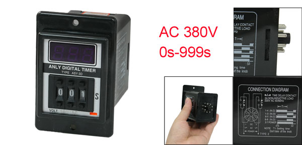 Product Name Time Relay Type ASY-3D Control Voltage AC 380V Frequency 50/60 Hz Contact AC 220V 5A Non-inductive Load Time Range 0-999 Seconds Mount Size (Approx.) 62 x 50 x 67mm/ 2.4" x 2" x 2.6" (L*W*Depth) Front Face Size 87 x 57m / 3.4" x 2.2"(L*W) Mount Hole Diameter 4.3mm/ 0.2" Total Length 90m / 3.5" Main Color Black Net Weight 202g Package Content 1 x Digital Time Relay - Reviews