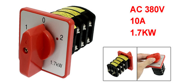 Power 1.7KW Positions 1-0-2 Terminal Number 12 Screw Terminals Body Diameter 42mm / 1.65" Overall Size 95 x 55 x 55mm / 3.7" x 2.2" x 2.2"(L*W*H) External Material Plastic Color Black, Red Net Weight 149g Package Content 1 x Changeover Switch