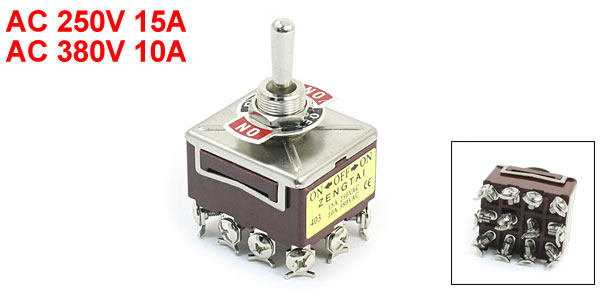Product Name Toggle Switch Type 4PDT (Latching) Position 3 Positions (ON/OFF/ON) Voltage, Current AC 250V 15A