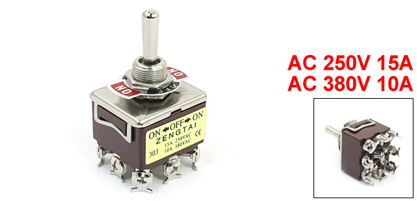 Product Name Toggle Switch Type 3PDT (Latching) Position 3 Positions (ON/OFF/ON) Voltage, Current AC 250V 15A