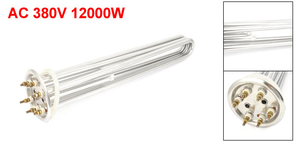 Product Name Water Heater Element Shape 3U Tube Bundle Type Main Material Stainless Steel Rated Voltage AC 380V Power 12000W Bar Diameter 10mm/ 0.39" Overall Size(Approx.) 38 x 5.3cm/ 15" x 2.1"(L*Max.D) Silicone Ring Dia. 82mm/ 3.2" Scew Diameter 3.5mm/ 0.14" Cable Hole Diameter 7mm/ 0.28" Color Silver Tone Weight 910g Package Content 1 x Water Heater Element