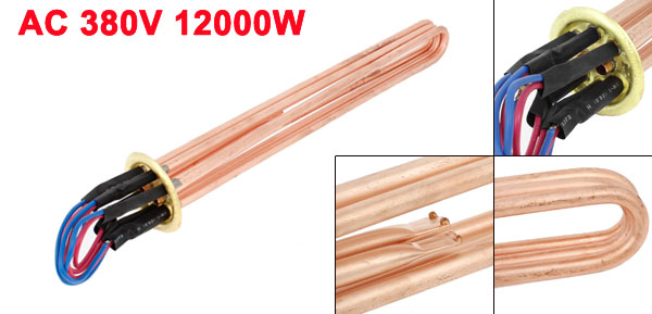 Product Name Water Heater Element Shape 3U Tube Bundle Type Main Material Stainless Steel Rated Voltage AC 380V Power 12000W Bar Diameter 7.5mm/ 0.3" Overall Size(Approx.) 45 x 3.6cm/ 17.7" x 1.4"(L*Max.D) Wire Part Length 9cm/ 3.5" Color Copper Tone Weight 540g Package Content 1 x Water Heater Element