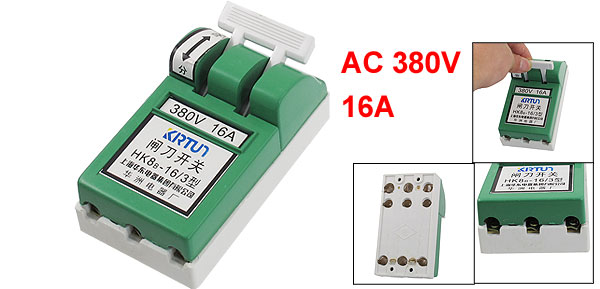 Product Name Knife Disconnect Switch Model No. HK8-16/3 Phase Three Phase Pole 3 Rated Voltage AC 380V Rated Current 16A Mounting Hole Diameter 4.5mm/ 0.18" Mounting Hole Distance 100 x 23mm/ 3.94" x 0.91"(L*W)(Center to Center) Overall Size(Approx) 114 x 63 x 49mm/ 4.5" x 2.5" x 1.9" (L*W*H) External Material Plastic Color Green, White Net Weight 187g Package Content 1 x Knife Disconnect Switch - Reviews