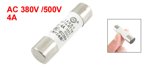 DetailsAC 380V 500V 4A Ceramic Tube Cylindrical Fuse Link 14mm x 51mm RT14 RT18  Product Name Ceramic Fuse Model RT14 RT18 Type Fast Blow Rated Voltage AC 380V/500V Rated Current 4A Dimension 14 x 51mm/ 0.55" x 2" (D*L) Material Metal, Ceramic, Electronic Parts Main Color White, Silver Tone Net Weight 15g Package Content 1 x Ceramic Fuses