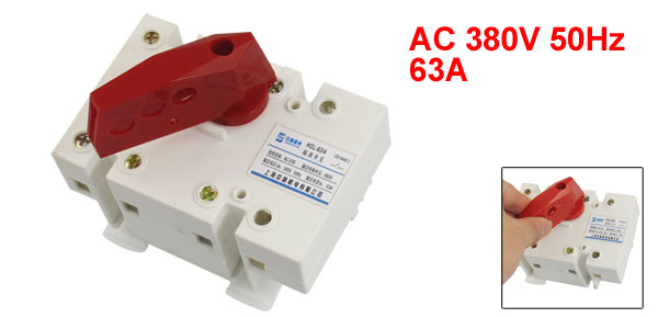 DetailsAC 380V 50Hz 63A 2P+E 660V Insulator 35mm Mounting Rail Circuit Isolating Switch  Product Name Isolating Switch Model No. HGL-63/4 Use Category AC-20B Poles Quantity 2P+E Rated Voltage AC 380V 50Hz Rated Current 63A Rated Insulator Voltage 660V Installing Size Standard 35mm Mounting Rail Screw Size 12.3 x 3.8mm/0.48" x 0.15"(L*Dia) Total Size 105 x 70 x 49mm / 4.13" x 2.76" x 1.93"(L*W*H) Key Size 7.3 x 4 x 2.5cm/2.87" x 1.57" x 0.98"(L*W*T) Material Plastic, Metal Main Color White Net Weight 322g Package Content 1 x Isolating Switch 1 x Key 1 x Screw 2 x Mounting Bracket