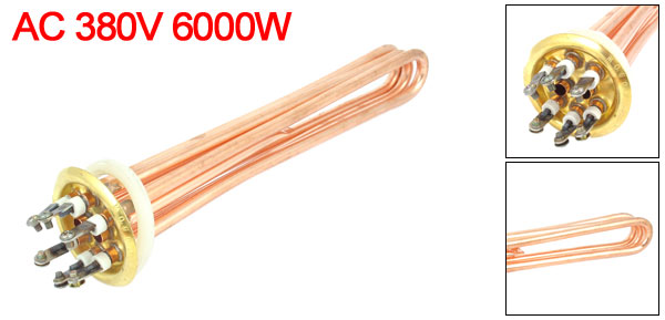 Product Name Water Heater Element Shape 3U Tube Bundle Type Main Material Stainless Steel Rated Voltage AC 380V Power 6000W Bar Diameter 7.5mm/ 0.3" Overall Size(Approx.) 28 x 3.6cm/ 11" x 1.4"(L*Max.D) Silicone Ring Dia. 58mm/ 2.3" Color Copper Tone Weight 416g Package Content 1 x Water Heater Element