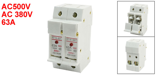 Product Name Fuse Holder Type RT18-63 Fit Fuse Type 10 x 38mm / 0.4" x 1.5"(D*H)(Included Here) Rated Insulation Voltage AC500V Rated Voltage AC 380V Rated Current 63A Poles Quantity 2P Material Hard Plastic, Metal Color White Mounting Type 35mm DIN Rail Overall Size(Approx) 78 x 48 x 103mm / 3.1" x 1.9" x 4"(L*W*H)