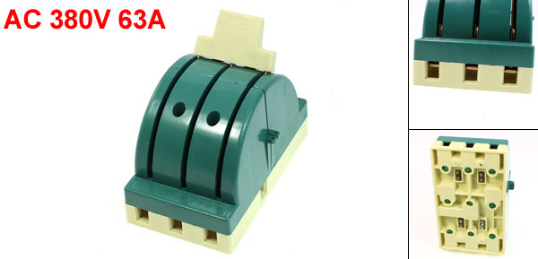 Product Name Disconnect Switch Model No. HK1A-63/3 Pole 3 Throw 2 Rated Voltage AC 380V Rated Current 63A Overall Size(Approx) 15.7 x 9.2 x 9.7cm/6.2" x 3.6" x 3.8" (L*W*H) External Material Plastic, Metal Color Green, Beige Net Weight 608g Package Content 1 x Disconnect Switch - Reviews
