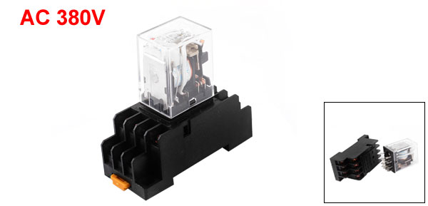 Product Name Power Relay w Socket Base Model HH54PL Socket Model PYF14A Coil Voltage AC 380V Light Color Red Type 4PDT(4NO 4NC ) Number of Terminals 14 Mount Rail Type 35mm DIN Rail Fixing Mount Hole Size 4.5 x 4mm/0.18" x 0.16"(L*W) Relay Size (Approx.) 4 x 2.7 x 2cm/1.6" x 1.1" x 0.8"(L*W*H) Socket Size 7 x 2.9 x 2.9cm/2.8" x 1.1" x 1.1"(L*W*H) Shell Material Plastic, Electric Parts Main Color Black, Clear Net Weight 45g Package Content 1 x Power Relay w Socket Base - Reviews