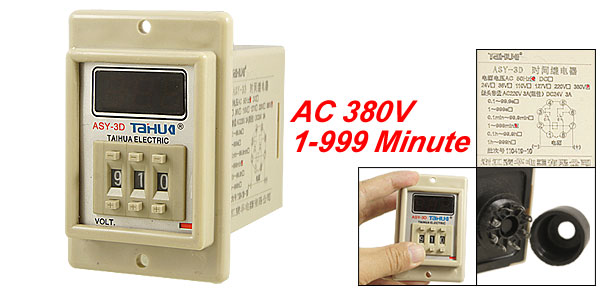 Product Name Time Relay Model ASY-3D Rated Voltage AC 380V 50Hz Contact Capacity AC 220V 3A(Resistive), DC 24V 3A Time Range 1~999 Minute Contact 8 Pin Panel Size (Approx.) 87 x 57 x 13mm/ 3.4" x 2.2" x 0.51" (L* W * T) Total Depth 103mm/ 4" Color Off White, Black Material Plastic, Metal Net Weight 288g Package Content 1 x Time Relay - Reviews