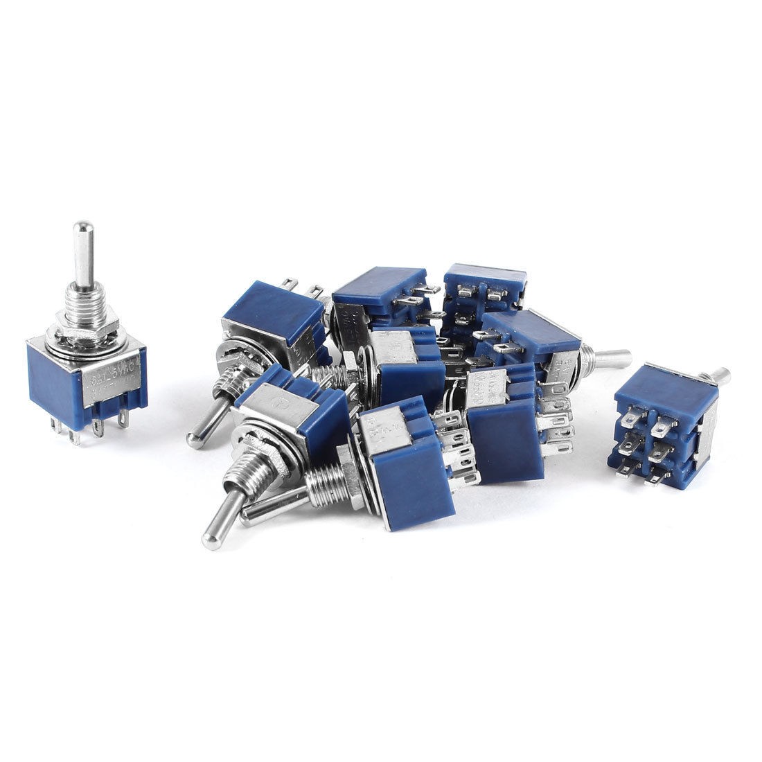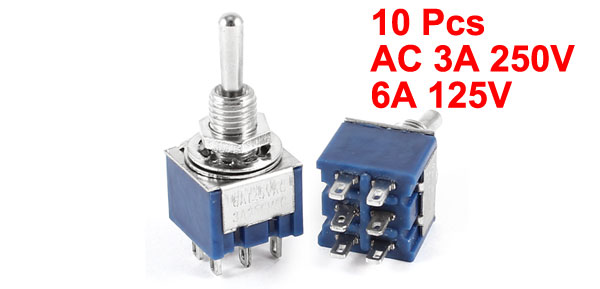 Product Name Toggle Switch Type SPDT(Latching) Position 3(On/Off/On) Voltage & Current 6A/ AC 125V / 3A AC 250V Main Body Size 13 x 13mm / 0.5" x 0.5"(L*W) Overall Height 33mm / 1.3" Material Metal & Resin Color Blue & Silver Tone Weight 54g Package Content 10 x Toggle Switch - Reviews