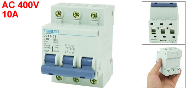 Product Name Circuit Breaker Model No. DZ47-63 C10 Exrternal Material Plastic, Metal Rated Voltage AC 400V 50Hz Rated Current 10A Breaking Capacity 4000A Total Size (Approx.) 77 x 53 x 74mm/ 3" x 2.1" x 2.9" (L*W*T) Number of Poles 3 Mount Type 35mm DIN Rail Mount Net Weight 245g Package Content 1 x Circuit Breaker - Reviews