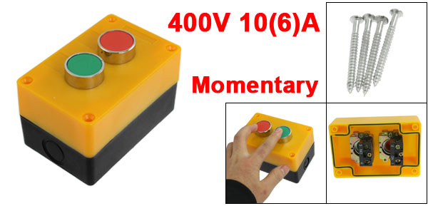 Product Name Push Button Switch Station Action Type Momentary Contact Type NC(Red), NO(Green) Working Voltage AC 400V Working Current 10(6)A Button Size 2.8 x 1cm / 1.1" x 0.4"(Diameter*Height) Casing Size 11 x 7.2 x 6.4cm / 4.3" x 2.8" x 2.5"(L*W*H) Casing Material Plastic Main Color Red, Green, Yellow, Black Weight 224g Package Content 1 x Push Button Switch Station - Reviews