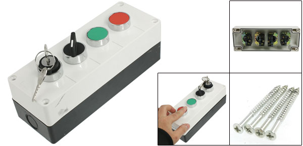 Product Name Push Button Station Working Voltage Current AC 400V 10(6)A Contact Type Red Cap: NC Rotary Switch, Green Cap: NO Action Type Momentary Selector Switch Mode One: on/off, 2 Position Another: Lock, 2 Position Material Plastic, Metal Button Diameter(Approx.) Red, Green Cap: 2.8cm/1.1" Body Size(not include the button) 19.3 x 7 x 6.5cm/ 7.6" x 2.7" x 2.5" (L*W*H)