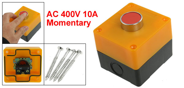 Product Name Push Button Switch Action Type Momentary Contact Type NC Working Voltage & Current AC 400V 10(6)A Push Button Diameter 2.5cm/ 0.98" Overall Size 7.7 x 7.1 x 6.4cm/ 3" x 2.8" x 2.5"(L*W*H) Shell Material Plastic Color Black, Orange Net Weight 152g Package Content 1 x Push Button Switch - Reviews