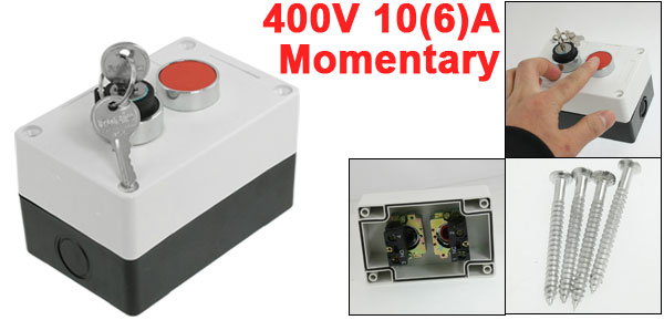 Product Name Push Button Switch Push Button Switch Action Type Momentary Contact Type Push Button Switch: NC Keylock Switch: NO Working Cuttrent 10(6)A Working Voltage AC 400V Button Diameter 2.8cm/ 1.1" Overall Size 11 x 7 x 6.5cm/4.3" x 2.75" x 2.5"(L*W*H) Shell Material Plastic Color Black, White Net Weight 268g Package Content 1 x Push Button Switch - Reviews