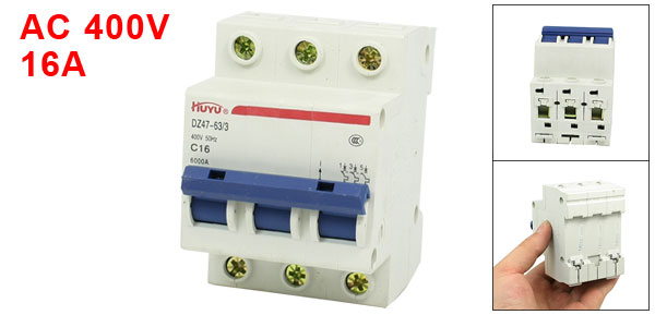 Product Name Circuit Breaker Model No. DZ47-63/3P C16 Exrternal Material Plastic, Metal Rated Voltage AC 400V 50Hz Rated Current 16A Breaking Capacity 6000A Total Size (Approx.) 77 x 65 x 54mm/ 3" x 2.6" x 2.1" (L*W*T) Number of Poles 3 Mount Type 35mm DIN Rail Mounted Net Weight 274g Package Content 1 x Circuit Breaker - Reviews
