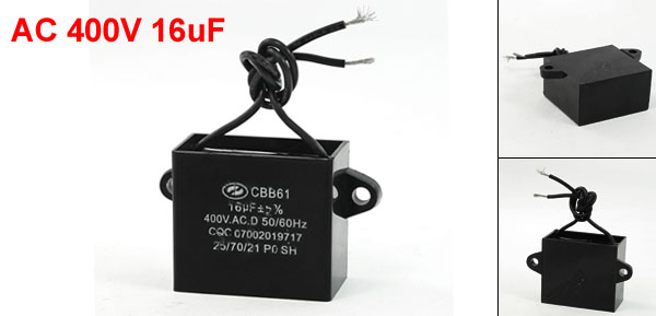 Product Name Motor Capacitor Model CBB61 External Material Plastic Dielectric Material Metalized Polypropylene Film Rated Capacitance 16uF Tolerance ±5% Rated Frequency 50/60Hz Rated Voltage AC 400V Body Size 48 x 25 x 42mm/ 1.9" x 1" x 1.65"(L*W*T) Fixing Hole Diameter 4mm/0.16" Cable Length 8.5cm/3.3" Net Weight 54g Package Content 1 x Motor Run Capacitor - Reviews