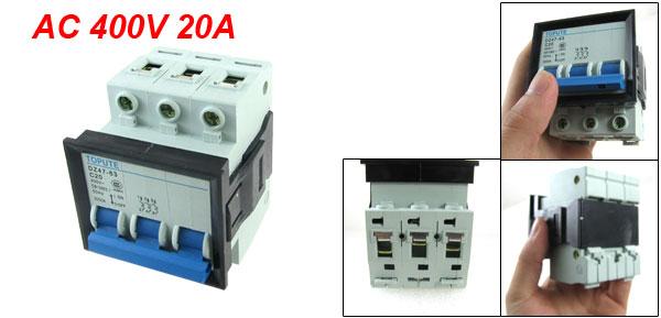 Product Name Miniature Circuit Breaker Model No. DZ47-63 C20 Rated Voltage AC 400V Rated Current 20A Rated Breaking Capacity 3000A Number of Poles 3P Overall Size (Approx.) 78 x 65 x 75mm / 3.07" x 2.6" x 3.0"(L*W*H) Material Plastic, Electric Components Weight 244g Package Content 1 x Miniature Circuit Breaker - Reviews