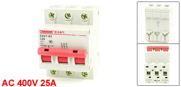 Product Name Circuit Breaker Model Number DZ47-63 C25 Rated Circuit Breaking Capacity 6000A Rated Current 25A Rated Voltage 400VAC Number of Poles 3 Mounting Rail Size 35mm DIN Dail Total Size (Approx) 7.6 x 5.4 x 6.5cm/ 3" x 2.1" x 2.6" (L*W*H) Material Plastic, Electric Components Weight 245g Package Content 1 x Circuit Breaker - Reviews