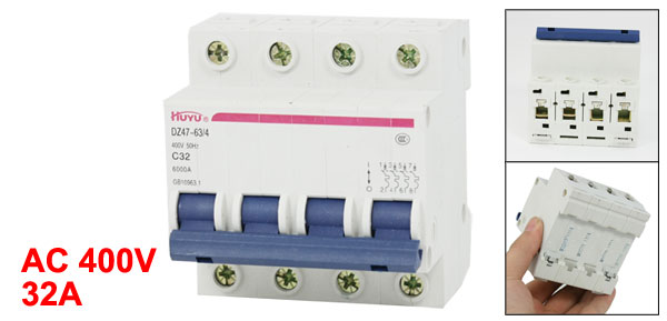 Product Name Circuit Breaker Model No. DZ47-63/4 Exrternal Material Plastic, Metal Rated Voltage AC 400V 50Hz Rated Current 32A Breaking Capacity 6000A Total Size (Approx.) 77 x 71 x 75mm/ 3" x 2.8" x 3" (L*W*T) Number of Poles 4 Mount Type 35mm DIN Rail Mounted Net Weight 381g Package Content 1 x Circuit Breaker - Reviews