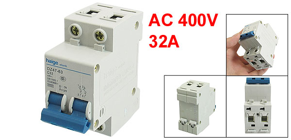 Product Name Miniature Circuit Breaker Model No. DZ47-63 C32 Rated Voltage AC 400V Rated Current 32A Rated Breaking Capacity 6000A Number of Poles 2P Overall Size (Approx.) 78 x 66 x 35mm / 3.07" x 2.6" x 1.4" (L*W*T) Material Plastic, Electric Components Weight 167g Package Content 1 x Miniature Circuit Breaker - Reviews