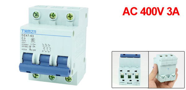 Product Name Circuit Breaker Model No. DZ47-63 C3 Exrternal Material Plastic, Metal Rated Voltage AC 400V 50Hz Rated Current 3A Breaking Capacity 4000A Total Size (Approx.) 77 x 53 x 74mm/ 3" x 2.1" x 2.9" (L*W*T) Number of Poles 3 Mount Type 35mm DIN Rail Mount Net Weight 250g Package Content 1 x Circuit Breaker - Reviews