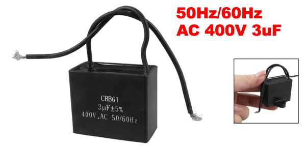 Product Name Fan Capacitor Model CBB61 Material(External) Plastic Rated Capacitance 3uF Tolerance +/-5% Rated Frequency 50Hz/60Hz Rated Voltage 400V AC Body Size 3.8 x 3.1 x 3.1cm/1.5" x 1.2"x 1.2"(L*W*H) Screw Hole Diameter 5mm/ 1/5" Cable Length(Approx.) 10cm/ 3.9" Weight 28g Package Content 1 x Fan Capacitor - Reviews