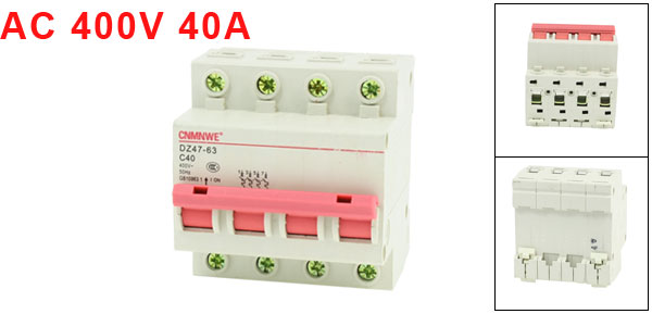 Product Name Circuit Breaker Model Number DZ47-63 C40 Rated Circuit Breaking Capacity 6000A Rated Current 40A Rated Voltage 400VAC Number of Poles 4 Mounting Rail Size 35mm DIN Dail Total Size (Approx) 7.6 x 6.5 x 7.5cm/ 3" x 2.5" x 3" (L*W*H) Material Plastic, Electric Components Weight 320g Package Content 1 x Circuit Breaker - Reviews