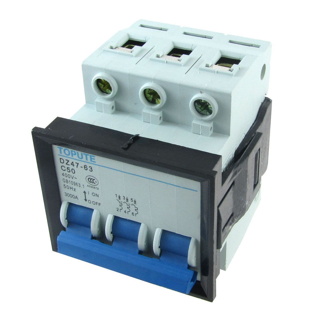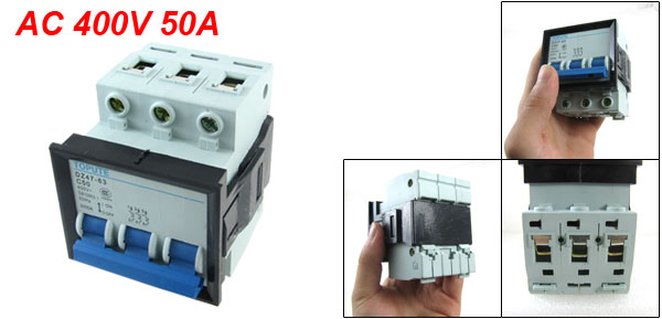 Product Name Miniature Circuit Breaker Model No. DZ47-63 C50 Rated Voltage AC 400V Rated Current 50A Rated Breaking Capacity 3000A Number of Poles 3P Overall Size (Approx.) 78 x 65 x 75mm / 3.07" x 2.6" x 3.0"(L*W*H) Material Plastic, Electric Components Weight 255g Package Content 1 x Miniature Circuit Breaker - Reviews