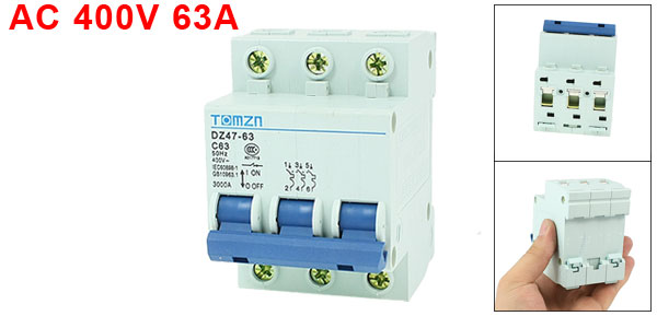 Product Name Circuit Breaker Model No. DZ47-63 C63 Exrternal Material Plastic, Metal Rated Voltage AC 400V 50Hz Rated Current 63A Breaking Capacity 3000A Total Size (Approx.) 77 x 53 x 74mm/ 3" x 2.1" x 2.9" (L*W*T) Number of Poles 3 Mount Type 35mm DIN Rail Mount Net Weight 262g Package Content 1 x Circuit Breaker - Reviews
