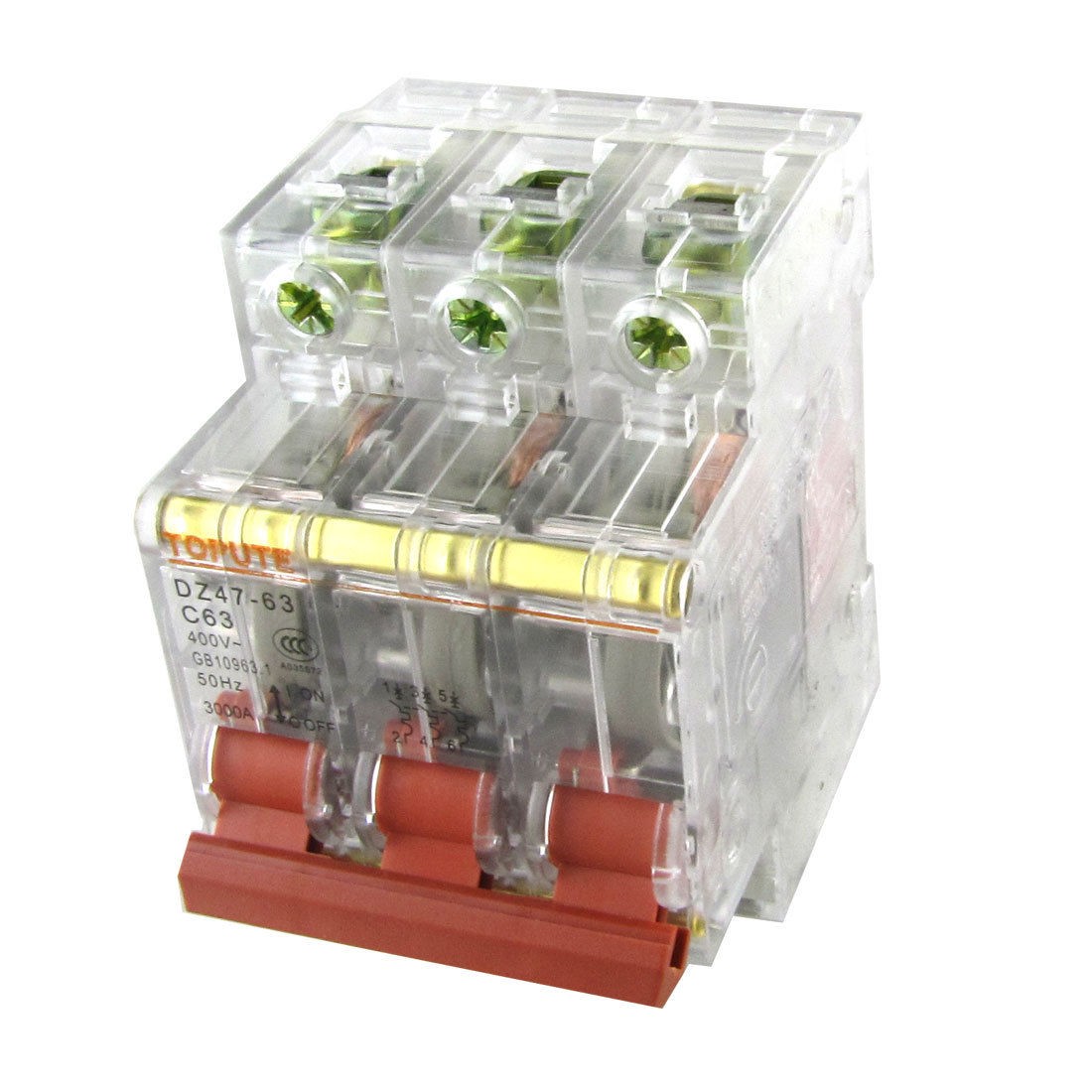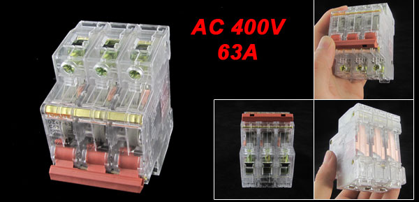 Product Name Miniature Circuit Breaker Model No. DZ47-63 C63 Feature Din Rail Mount, Transparent Rated Voltage AC 400V Rated Current 63A Rated Breaking Capacity 3000A Number of Poles 3P Overall Size (Approx.) 80 x 53 x 75mm / 3.1" x 2.1" x 3.0"(L*W*H) Material Plastic, Electric Components Weight 234g Package Content 1 x Miniature Circuit Breaker - Reviews