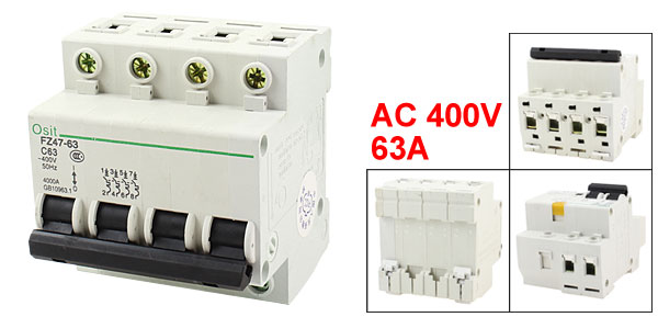 Product Name Miniature Circuit Breaker Model Number FZ47-63 C63 Rated Circuit Breaking Capacity 4000A Rated Voltage AC 400V 50HZ Rated Current 63A Poles 4 Pole Rail Mounting 35mm DIN Rail Overall Size (Approx) 74 x 72 x 77mm/ 2.9" x 2.8" x 3" (L*W*T ) Material Plastic, Electric Components Color White,Black Weight 350g Package Content 1 x Miniature Circuit Breaker - Reviews