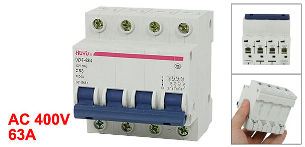 Product Name Circuit Breaker Model No. DZ47-63/4P C63 Exrternal Material Plastic, Metal Rated Voltage AC 400V 50Hz Rated Current 63A Breaking Capacity 4000A Total Size (Approx.) 77 x 71 x 75mm/ 3" x 2.8" x 3" (L*W*T) Number of Poles 4 Mount Type 35mm DIN Rail Mounted Net Weight 375g Package Content 1 x Circuit Breaker - Reviews