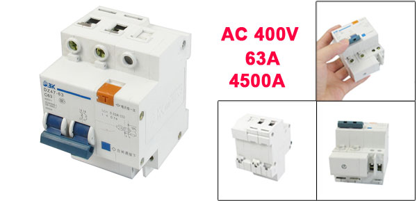 Product Name Earth Leakage Circuit Breaker Model DZ47-63 C63 Number of Poles 2P+N Rated Voltage AC 400V Rated Circuit Breaking Capacity 4500A Rated Current 63A Mounting Type DIN Rail Total Size (Approx.) 9.4 x 6.2 x 7.1cm/ 3.7" x 2.4" x 2.8" (L*W*H) Material Plastic, Electric Components Color As Picture Shown Weight 270g Package Content 1 x Earth Leakage Circuit Breaker - Reviews