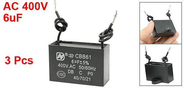 Product Name Motor Capacitor Model CBB61 External Material Plastic Dielectric Material Metalized Polypropylene Film Rated Capacitance 6uF Tolerance +/-5% Rated Frequency 50/60Hz Rated Voltage AC 400V Body Size 48 x 32 x 20mm/ 1.9" x 1.3" x 0.8"(L*W*T) Fixing Hole Diameter 4.5mm/0.18" Cable Length 11cm/ 4.3" Net Weight 105g Package Content 3 Pcs x Motor Run Capacitor - Reviews